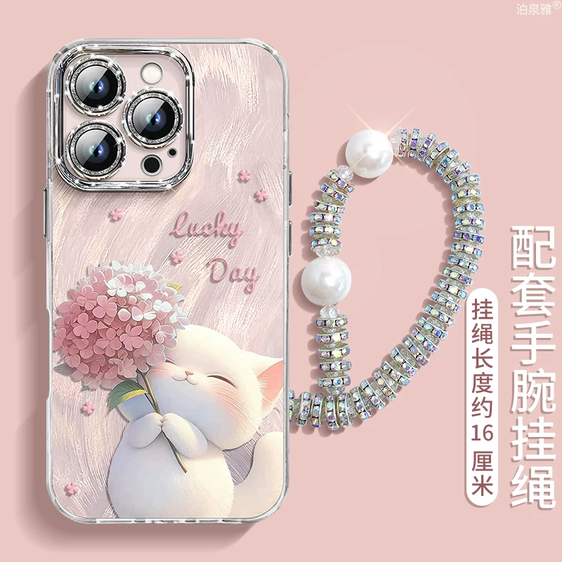 自带镜头膜【闪粉镜羽纱】绣球猫-粉白色⭐挂绳
